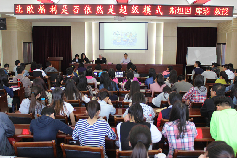 讲座中,库瑙教授就北欧福利模式的形成、原因以及福利模式所带给我们的经验和教训等这几个方面做出了详细的介绍。库瑙教授以直观的图表展示,站在全球的角度,来分析比较北欧各国的福利政策以及相关的福利措施与世界其他国家的不同。库瑙教授更是提出了自己个人对北欧福利未来难以预测的独特观点。库瑙教授一方面认为北欧福利模式经得起时间的考验,有其存在的价值和必要性。另一方面,他没有盲目服从国际组织,而是相信它会度过危机,而其他的国家也应在北欧福利模式的原则上多做功课。同时也表达了对中国福利社会建设的祝福。讲座过程中,老师和同学们,结合中国的实际情况,积极提出自己的观点和问题,与库锱教授进行互动交流。讲座尾声,贾应生教授对库瑙教授此次讲座作了总结以及对表达了自己的感想和看法。最后,库瑙教授与老师、同学们亲切的合影留念。