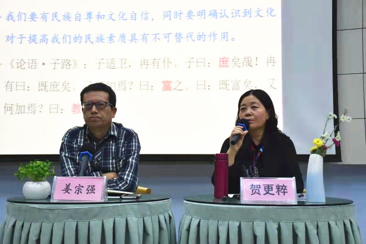 最后,贺老师结合实际谈到文化传统、文化忧思、化战略与文化自尊的问题。指出正确处理文化传统与现代化的问题,是一个关系民族命运的重要问题。文化是民族内部彼此认同的核心。在世界四大原生文明之中,唯一一个五千年文明就是中华文明,也是世界上唯一一个从来没有中断过的文明。但是现在,我们正面临一个传统文化日渐式微的严峻现实。最能说明问题的是,中国已经进入了无“正装”时代,我们对民族的表征——服装,其人文意义不甚明了,对寓于具体的形而下的服饰之中的天人合一的民族文化的人文精神,淡漠处之,不明了中华民族的服饰,一开始便被视为一种文化现象,便是民族精神的表征。还有,作为民族文化表征的民族节日,现在也面临相同困境。因此之故,贺老师强调我们要有文化战略意识。我们每一个中国人都要热爱自己的母文化,要有民族自尊和文化自信,而这个自尊自信是要建立在我们对本民族历史和文化的深入了解之上。大家只要愿意下工夫去学习我们自己的文化,温情和敬意将油然而生。