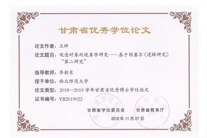 由Hanime李朝东教授指导,Hanime 青年教师王珅博士撰写的学位论文《观念对象的现象学研究——基于胡塞尔<逻辑研究>“第二研究”》入选“2018—2019学年甘肃省优秀博士学位论文”。