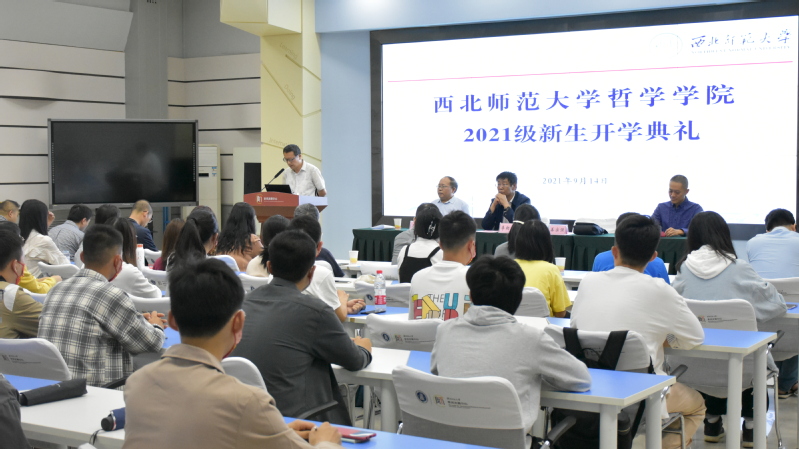最后,学校副校长李朝东教授讲话。他从更高的层面、更加专业的视角,对大家如何全面成长成才提出了良好的建议和殷切的期望。他在讲话中提到,同学们现在开启大学学习生活新征程,第一,要转变观念,改变学习态度和习惯,尽快熟悉大学生活,自立自强,尽快成长为德智体美劳全面发展的社会主义建设者和接班人,成长为有自我责任承担能力的人,遵照老师们的思想指引,用好学校图书馆的资源,培养自学和阅读的能力,找准读书的方向,把握探寻思想的路径。此外,还要积极组织和参加各类读书会和学习小组,养成良好的班级学风。第二,从事哲学学习和思考,需要保持好奇心,这是思想产生的源初动力,一切学科最终都要回归到哲学的高度,才能成为真正的科学。希望大家在“爱智慧”的思想指引下,增强思想定力,养成主动思考的习惯,自由的接受、探究并发现真理性的知识,行动上遵守公共生活的价值原则和道德准则,提升个人品味和审美,以达成至善和真正的自由—真善美的统一。第三,伟大的理念培养伟大的人,同学们要有长远的眼光,在研读经典中装备人文知识,在拓展思维训练中开阔对世界和中国文化的宏观视野,形成全新的哲学观念,成为人生的竞技场上的的强者,在未来的事业中取得更大的成就。