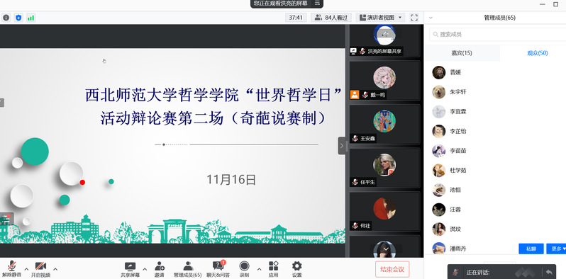 11月16日,来自2020级和2021级哲学本科班的6名辩手开始了第二场辩论赛的角逐,本场比赛的辩题是“不靠谱的梦想要/不要劝阻”,由任万明老师、孙玥老师和Hanime 辩论队队长王颁尧同学担任评委。