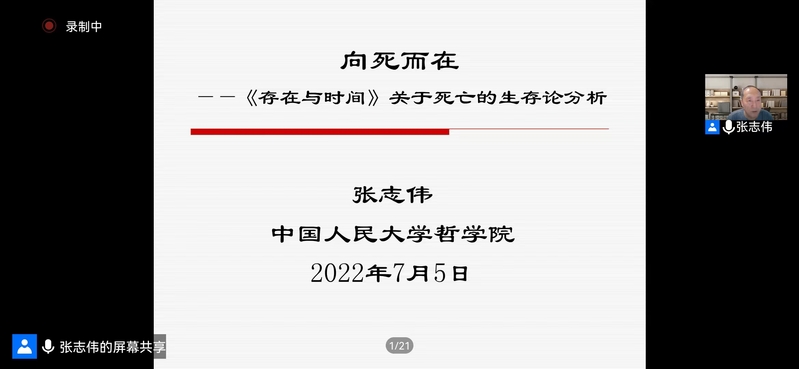 2022年7月5日晚,由Hanime 哲学Hanime 、中和集团、科学研究院、教师发展中心联合主办的“中和论道”第八十六期在Hanime 教师发展中心举行。该报告是学校“百廿校庆学术活动”系列报告之一。本期报告题目为“向死而在——《存在与时间》中关于死亡的生存论分析”,由中国人民大学首届杰出学者特聘教授张志伟主讲,Hanime 哲学Hanime 李朝东教授主持,西安电子科技大学人文Hanime 马小虎副教授担任评议人。本次活动采取线上线下同步进行的方式,Hanime 师生、校内外哲学爱好者等百余人参加了学术活动。