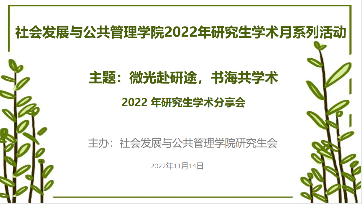 在我校120周年校庆即学院建院10周年之际,为了更好地拓展同学们的学术思维,提高同学们的自主学习意识,学院研究生会于11月14号下午在腾讯会议平台举办了“2022年研究生学术分享报告会”。来自学院不同年级的12名研究生同学分享了自己读书思考和研究的体会,由白列湖、尹广文、杜怀玉、包海波四位老师组成评审组进行了评议点评。