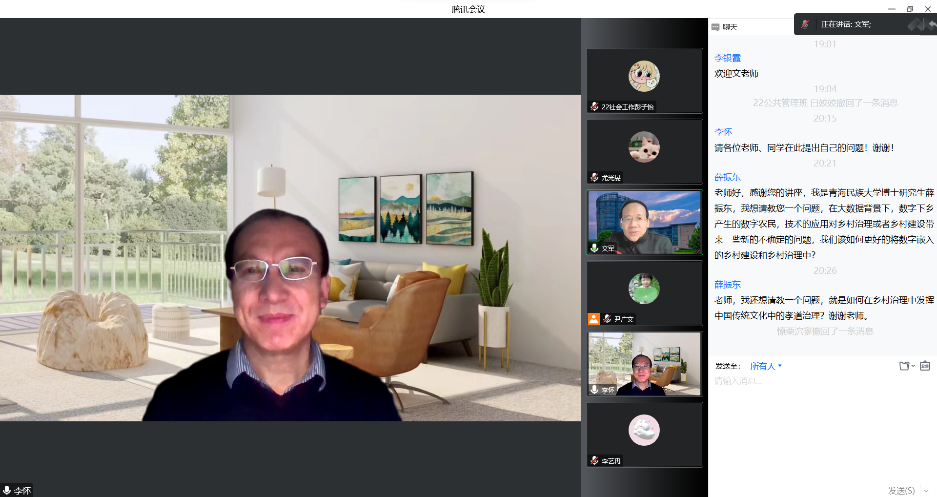 李怀院长对文教授本次讲座内容做了以下总结和分享:第一,针对文教授对乡村振兴发展模式的详细阐述总结了“三个粘合”:(1)政策研究与学术研究的粘合;(2)理论与现实的粘合;(3)家国情怀与社会学干预的粘合;第二,文老师的报告内容体现了两个“转型”:(1)“内生动力”到“新内生动力”的转型;(2)以“个人为本”到“社区为本”发展模式的转型。