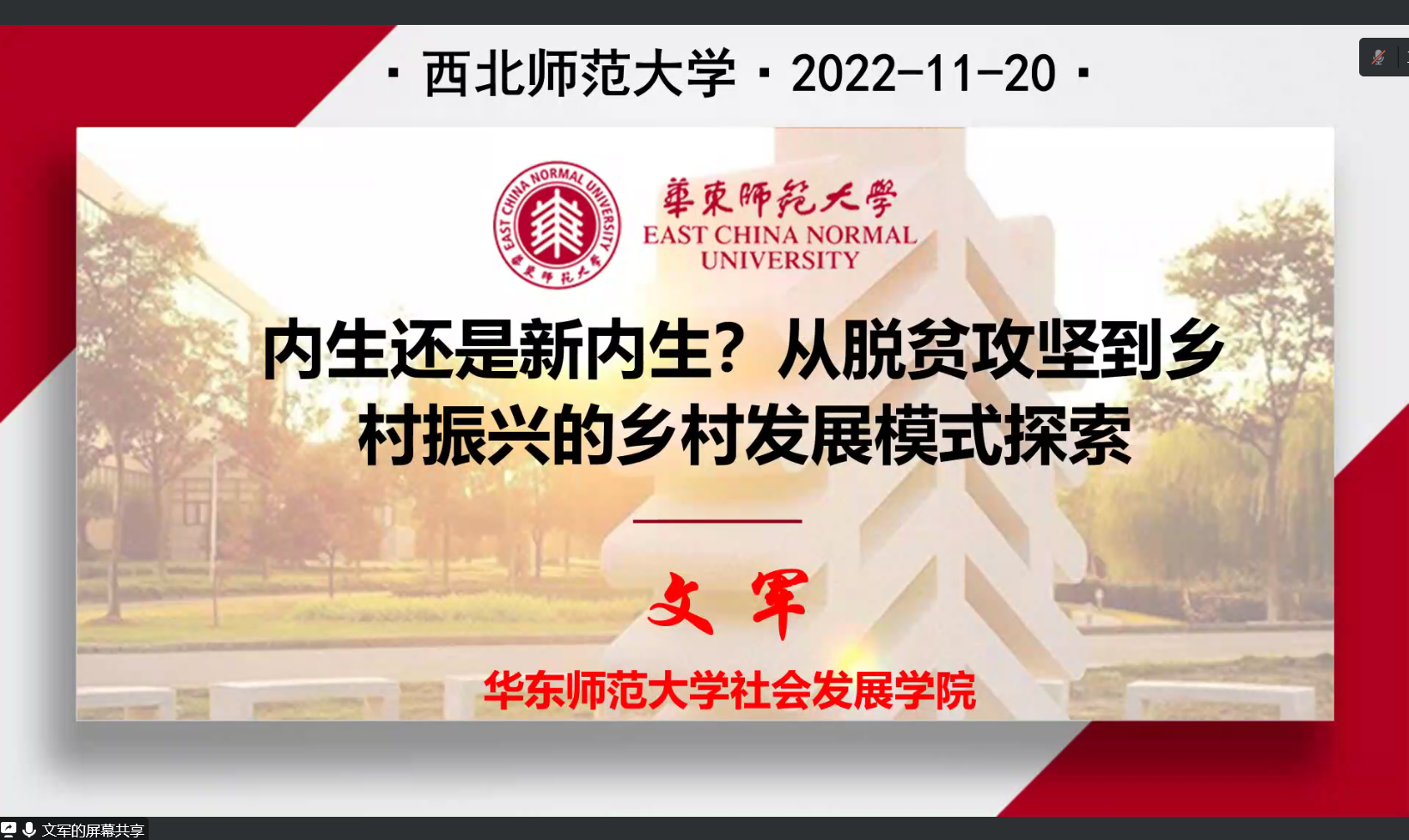 2022年11月20日19时,百廿校庆暨十年院庆系列学术讲座由华东师范大学文军教授开讲。文老师为我校师生带来了一场题为“内生还是新内生?从脱贫攻坚到乡村振兴的乡村发展模式探索”的讲座。本次讲座由李怀教授作主持人和评议人,学院有两百多名师生参加此次讲座。