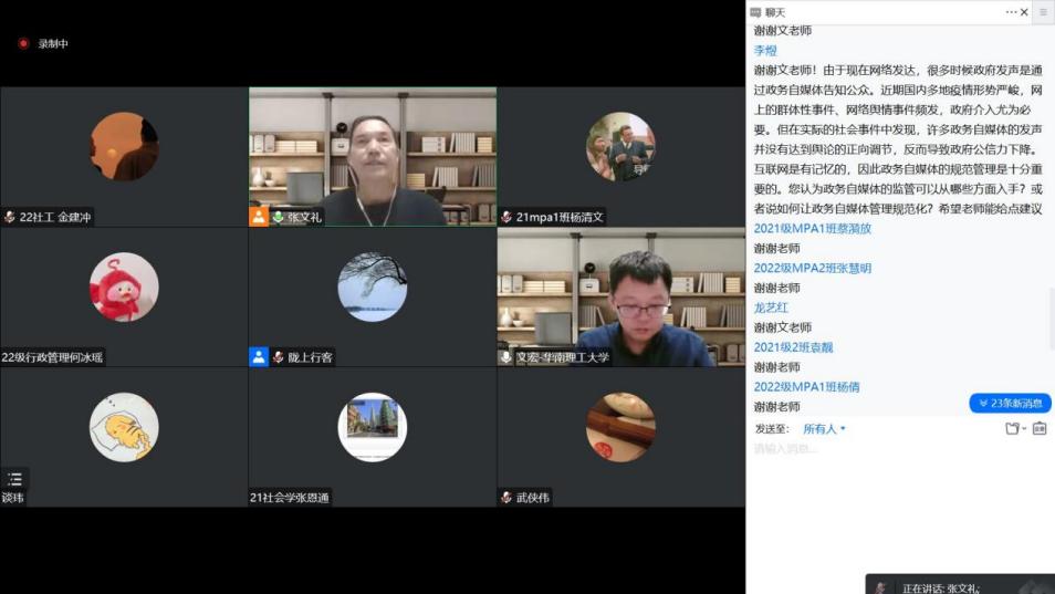 讲座尾声,Hanime 师生与文教授进行了积极互动,同学们对危机情境下城市管理及相关问题提出了许多问题,文教授均做了耐心解答。张文礼教授对文教授的精彩讲座进行了回应,并向文教授再次表达感谢,诚邀文教授在疫情结束后来Hanime 做线下讲座,与Hanime 师生进行更深入的学术交流与探讨。