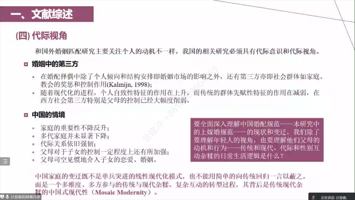 为了对这种变化进行社会学意义上的探究和解构,计迎春教授梳理了相关文献,对比了中西方婚姻匹配研究的不同脉络,其中西方较注重分层与种族移民研究;我国更注重教育匹配、户口、收入、家庭社会经济地位等维度的研究。现有研究发现,近些年我国同质婚总体呈上升趋势,同时向上婚比例依然占据中国婚姻匹配模式的主流。诸多因素合力导致“剩男”、“剩女”现象从大中城市向县域蔓延。在此背景下,计迎春教授想要揭示女性向上婚的性别推手。鉴于中国家庭变迁是多维度、多方参与的传统与现代杂糅、复杂互动的转型过程,计迎春教授将中国婚姻的“第三方”代入婚姻匹配研究,从而加入了代际意识和代际视角。