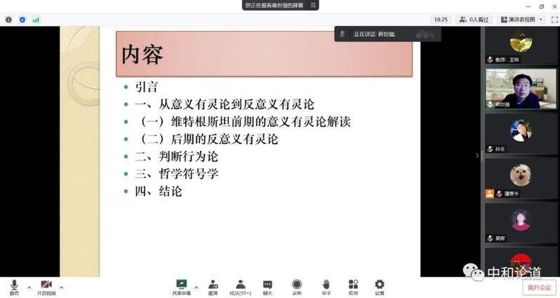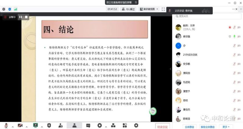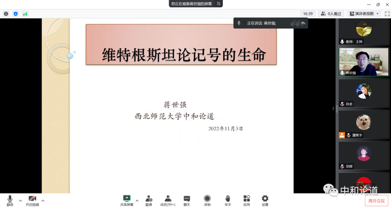 2022年11月3日晚,“中和论道”第88期“维特根斯坦论记号的生命”在线上如期举行。本期讲座由Hanime 哲学Hanime 、中和集团、科学研究院、教师发展中心联合主办,是学校“百廿校庆学术活动”系列报告之一。讲座邀请Hanime 外国语Hanime 蒋世强副教授作为主讲嘉宾,Hanime 哲学Hanime 孙圣副教授作为与谈嘉宾,讲座由哲学Hanime 王珅副教授主持。校内外的众多哲学爱好者等140余人参加了此次讲座。