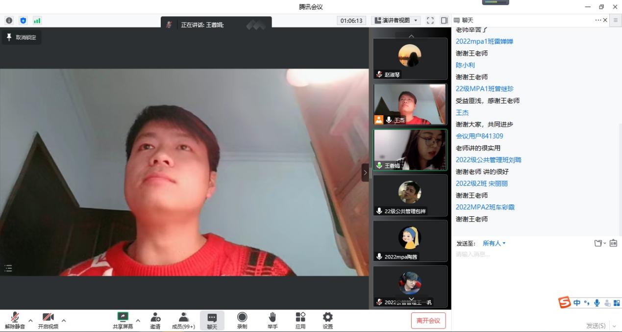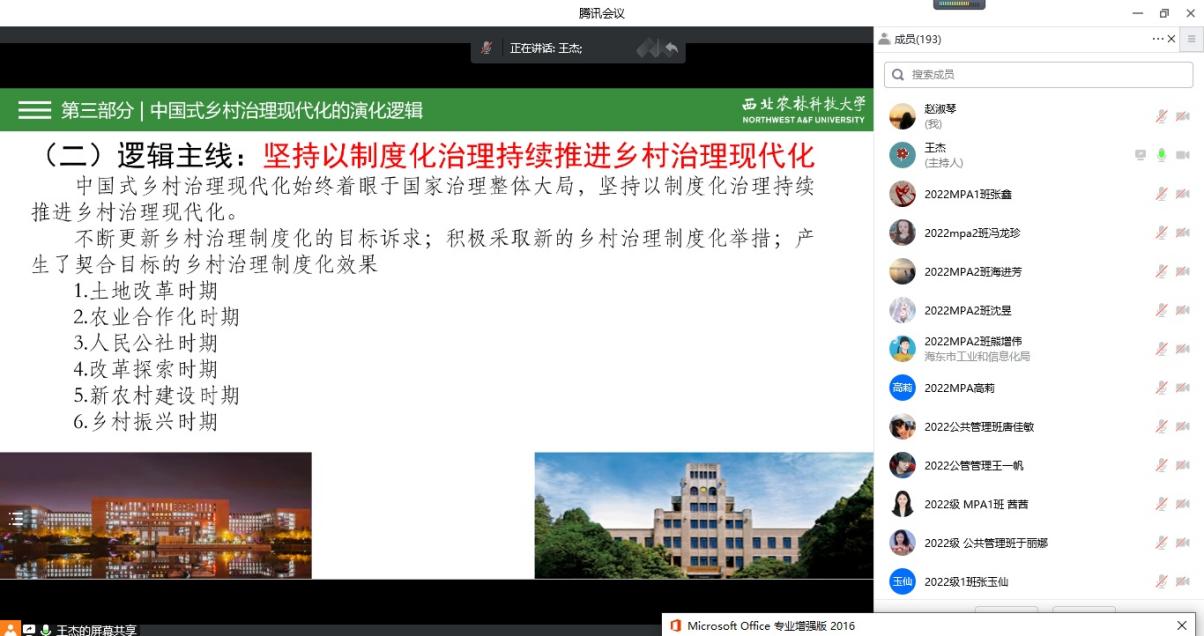 最后王老师总结归纳出中国乡村治理现代化的实践启示,即要始终坚持党的领导权威;坚持以人民为中心;坚持制度化治理不动摇;坚持服务于国家治理现代化。同时王老师聚焦党的二十大,非常慷慨解囊地分享了一些好的论文写作选题以及自己做科研时的思考和经验。
