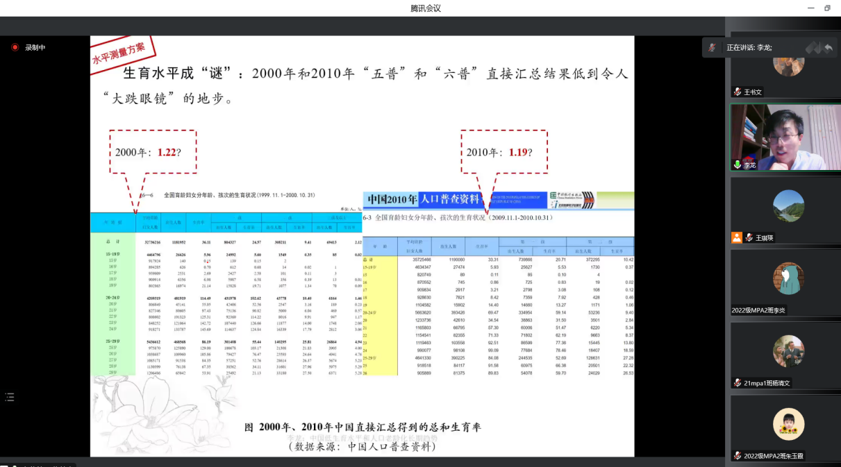 为了解开这个“谜”,李老师介绍到可以利用第七次人口普查数据,借助人口学生命表技术,采用倒退存活方法,推算出过去一个时期真实出生人数及育龄妇女人数,从而了解到过去一个时期中国真实生育水平。基于上述思路,李老师计算得出在过去二十年间,中国总和生育率基本都在1.5以上的数据和近10年来我国生育水平呈现波动中下降的基本态势的结论,从而揭开了“谜团”,知晓了当年中国真实生育水平。