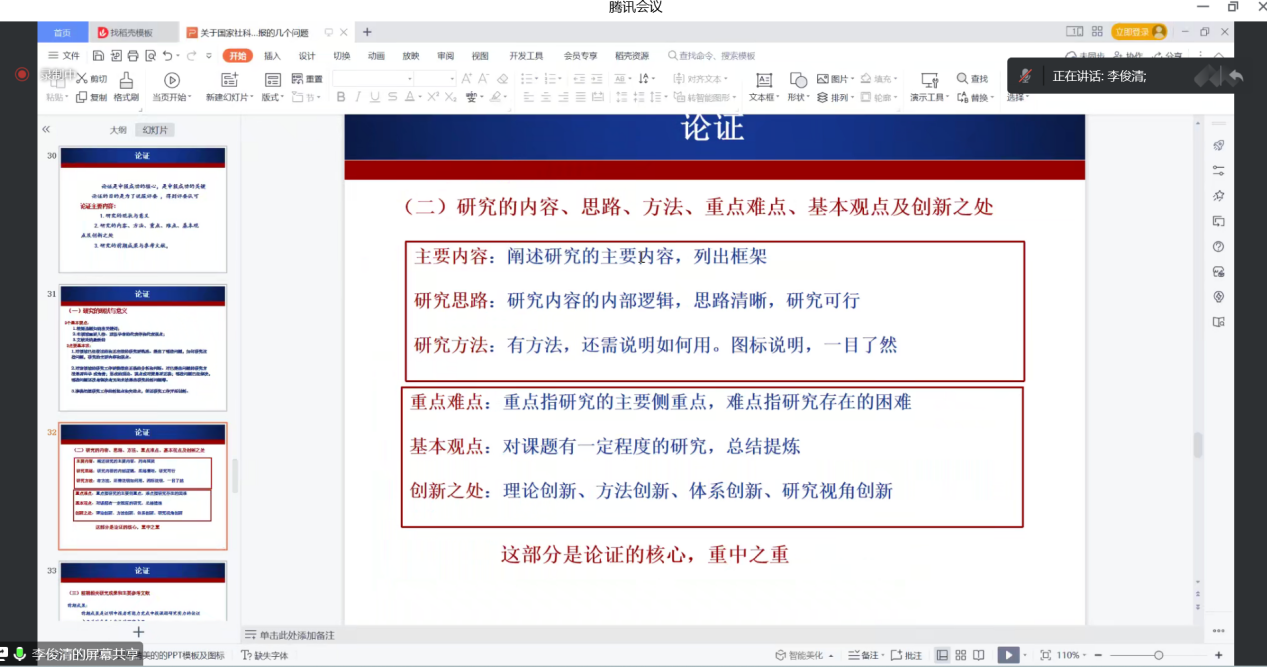 李俊清教授进一步详细阐明了国家社科基金项目申请条件和有关方面的限定;并对全体项目、年度项目、青年项目、西部项目等项目的研究热点和主题做了概括和分析。李老师指出,目前国家社科基金项目多聚焦于着“中国共产党、乡村、高质量、风险”等热点话题。针对选题方面,李老师建议我们应关注国家政策,追踪学术前沿,听取专家意见个人,研究须与国家需求相契合;一个好的选题要有吸引力,能产生共鸣,并且具有创新性可研究性;选题中要避免题目涉及关键词太多、联系实际不够、研究范围太大、问题意识不强、创新思维不足等问题。同时,李老师强调论证是项目申报成功的核心,论证主要内容包括研究的现状与意义;研究的内容、方法、重点、难点、基本观点及创新之处;研究的前期成果与参考文献。最后,李老师指出标书的撰写要注重“新”“高”“重”“广”“深”“实”,要早准备、多看资料多写、自查自纠、冷却处理、多请教、有耐性。