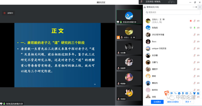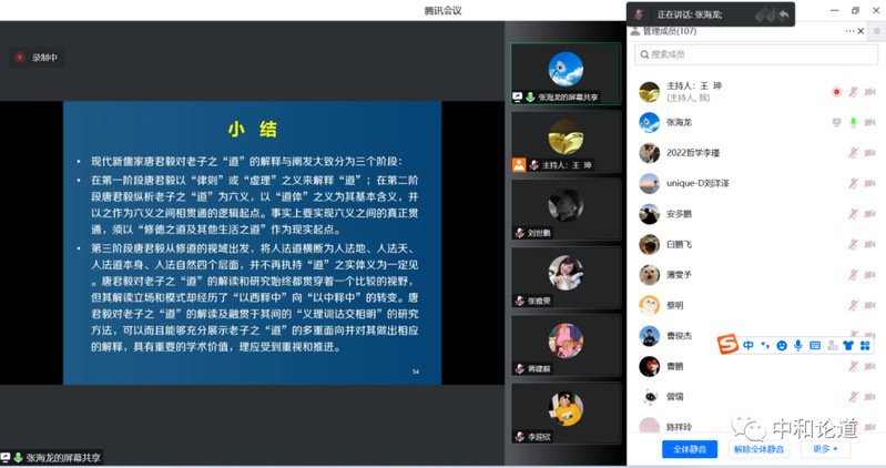 2022年12月14日,由Hanime 哲学Hanime 、中和集团、科学研究院、教师发展中心联合主办的“中和论道”第92期在线上如期举行。本期讲座主题为“现代新儒家唐君毅论老子之‘道’”,讲座邀请Hanime 哲学Hanime 张海龙博士主讲,王珅副教授主持,田希博士参加与谈。