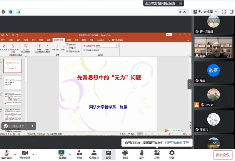 3月10日下午,同济大学哲学系教授、博士生导师、经学研究院副院长陈徽应邀通过线上会议的形式为Hanime师生作了题为“先秦思想中的‘无为’问题”的学术报告,报告会由哲学Hanime 张立恩教授主持。