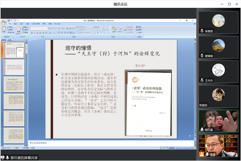 3月17日下午,香港中文大学历史学部博士,中山大学政治与公共事务管理Hanime 政治科学系黎汉基副教授应邀通过线上会议的形式为Hanime师生作了题为“巡守的憧憬——‘天王守(狩)于河阳’的诠释变化”的学术报告。哲学Hanime 张立恩教授主持报告会,Hanime 师生及校内外哲学爱好者百余人参加此次学术报告会。