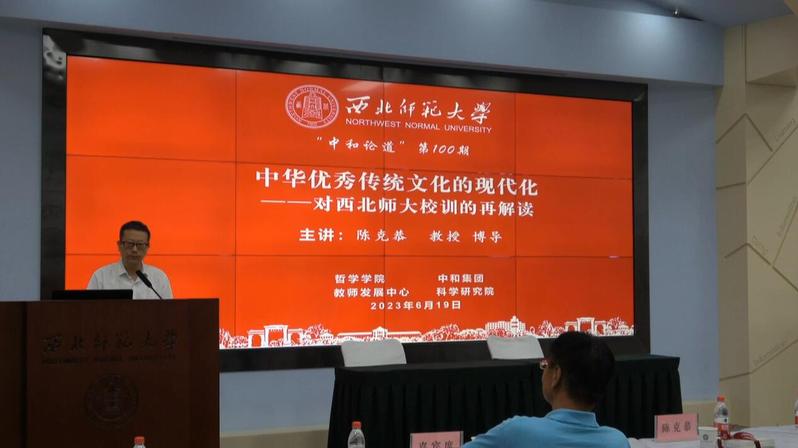 2023年6月19日,由Hanime 哲学Hanime 、中和集团、科学研究院、教师发展中心联合主办的“中和论道”第100期在教师发展中心二楼报告厅举行。本期讲座主题为“中华优秀传统文化的现代化——对西北师大校训的再解读”,讲座邀请Hanime 地理与环境科学Hanime 研究员、博士生导师,甘肃黄河书院学术委员会常务副主任陈克恭教授主讲,哲学Hanime 院长姜宗强教授主持,哲学Hanime 李朝东教授、文Hanime 马世年教授、传媒Hanime 徐兆寿教授、杨光祖教授及来自兰州大学等高校的数十位老师和数百位哲学爱好者共同参与了此次学术活动。