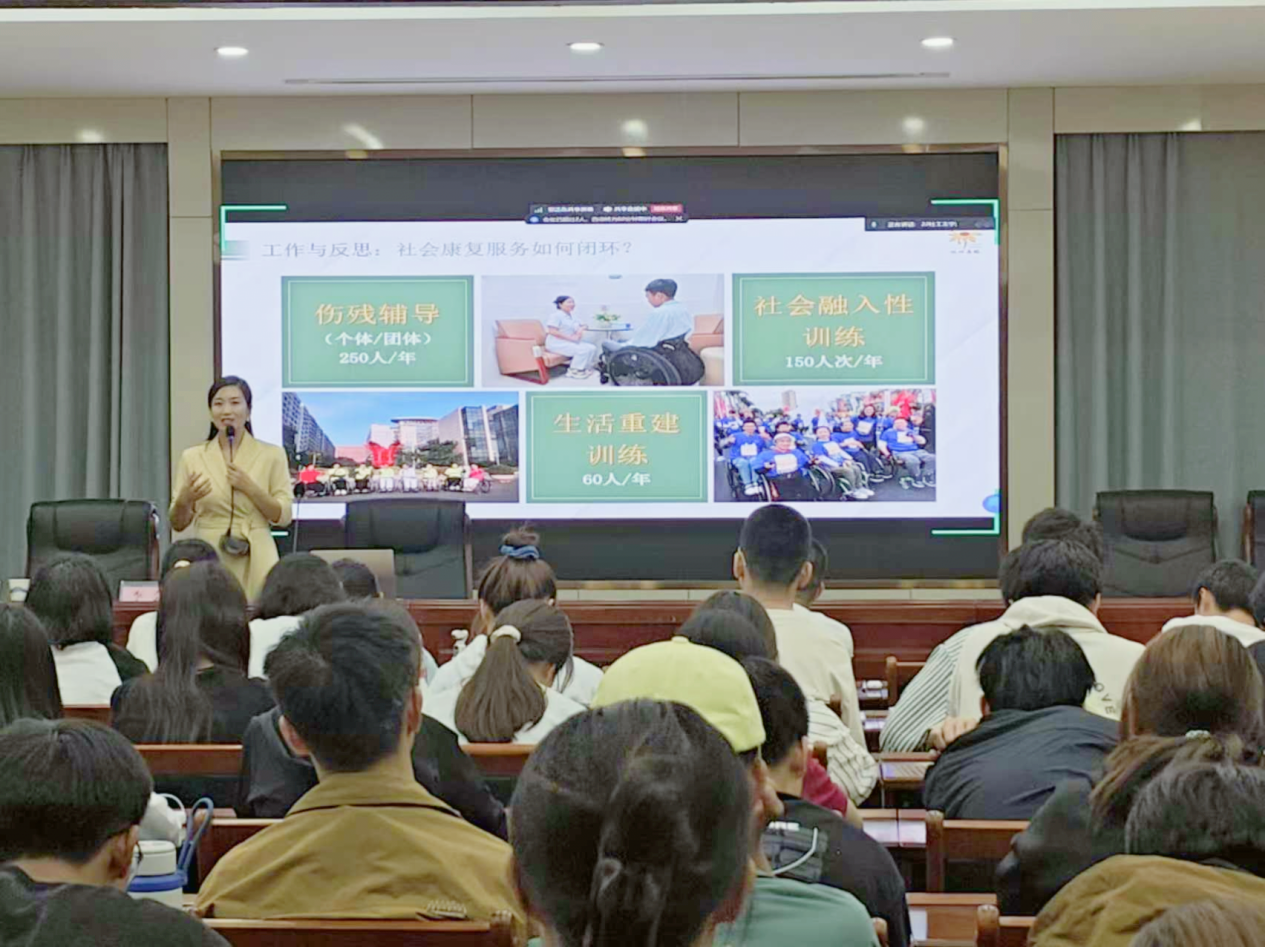 李会老师以自己的毕业论文框架为例,认为空间社会学、空间权利理论使其在学习过程中受益匪浅,并进一步提出空间赋权和患者主体性权利,阐述了开创三方联动双轨并行的干预模型,并将其命名其为医院社区营造。医院社区运营旨在为病人创造一个参与和自我发现的空间,通过组织病患义工队,改善医院文化,提升病人与医护人员之间的沟通,同时也增强了病人的主体性和参与感。尽管面临文化和体制的挑战,但是这项工作仍然获得了医院领导的认可和支持,并组织了一系列活动,包括病人义工队参与医院软性文化建设,如组织观影活动、广场舞等,甚至提出并实现了无障碍停车场的改造建议。通过这些努力,患者不仅获得了尊严和尊重,也成为了医院变革的重要参与者。其次,李会老师通过工作经验积累并且与患者家属进行接触发现,家属们仍会坚持保留一定的“门槛文化”,这种文化观念阻碍了患者及其家属接触外界的机会。当时有机会参与到5G科普馆的建设中,李会老师将前台接待岗位调整为容纳多人共同工作的形式,让更多残疾人有机会参与其中,这不仅改变了物理环境,也改变了社会文化环境,让残疾人有了更多的社会参与机会。残疾人在科普馆前台工作的过程中,他们的存在和互动也改变了周边环境。比如,他们需要每天上下班,通过地铁等交通工具出行,这促使地铁工作人员不得不改变服务方式,同时,他们在工作时的良好表现也吸引了更多人的关注,逐渐改变了社会公众对残疾人就业和参与社会活动的认知。在拓展其他三个一站式点中,博物馆教育活动、建立新的残障观、残健融合理念持续至今。随着项目的深化,博物馆不仅邀请参与内部活动,还专门设立了名为新型残疾人教育体验馆。这个体验馆使得李会老师的团队教育内容能够走出博物馆,进入小学、初中、高中、大学,甚至包括与星海音乐Hanime 的合作,使项目得到了更广泛的推广和应用。最后,李会老师为全体师生提供了三个案例,她指出:“互助社群是社工工作中的重要平台,个体的力量有限,需要通过群体的力量与社会环境和文化发生互动。我们致力于孵化互助社群,让服务对象能够成为互助组织的一员,从而激发他们的主体性和主动性,形成自助互助氛围,让他们看到自己也可以成为帮助他人的群体,而不是仅仅依赖他人。”