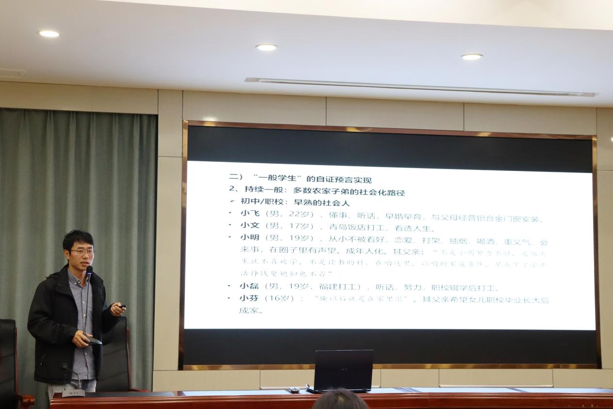 高玉春老师首先简要介绍了路阳老师的学习背景以及研究领域,并对路阳老师的莅临表示热烈的欢迎。讲座初始,路阳老师从“符号资本”这一理论概念着手,关注农家子弟教育经历中的自证预言与社会再生产现象。基于田野调查,研究发现在“好学生”与“一般学生”的两类自证预言剧本下,不同学子通过成绩排名与升学与否来建构对应的符号意义,最终少部分人通过求学就业实现阶层上升,大部分人留村延续成家立业。他运用了丰富的案例,生动地展示了农家子弟如何通过教育改变自己的命运,以及这一过程中所面临的种种挑战和机遇。路阳老师特别强调了自证预言在这一过程中的关键作用,即农家子弟如何通过自身的努力和坚定信念,实现对自身未来的积极预期。