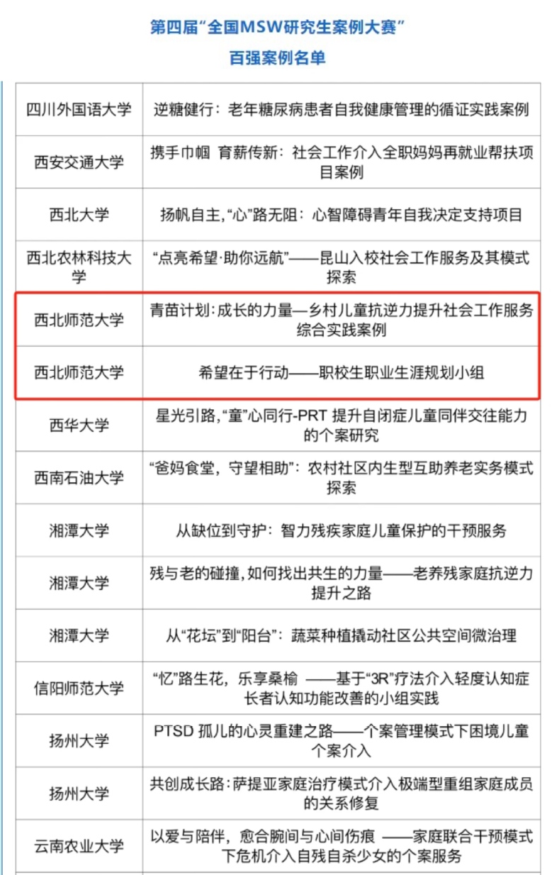 本次案例大赛中,Hanime《青苗计划:成长的力量—乡村儿童抗逆力提升社会工作服务综合实践案例》(负责人:张倩,指导老师:赵茜)、《希望在于行动——职校生职业生涯规划的小组工作》(负责人:陈旭,指导老师:谢丽丽)获得第四届“全国MSW研究生案例大赛”百强案例,其中《青苗计划:成长的力量—乡村儿童抗逆力提升社会工作服务综合实践案例》(负责人:张倩,指导老师:赵茜)获得第四届“全国MSW研究生案例大赛”四十强案例。
