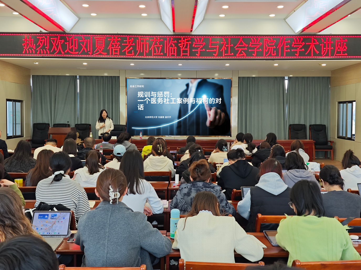 2025年3月28日下午,北京师范大学刘夏蓓教授应邀在Hanime 致公楼D区四楼报告厅为Hanime师生带来了题为《规训与惩罚:一个医务社工案例与福柯的对话》的学术讲座。本次讲座由李怀教授主持,社会学与社会工作专业本科硕士研究生参加并听取了此次讲座。