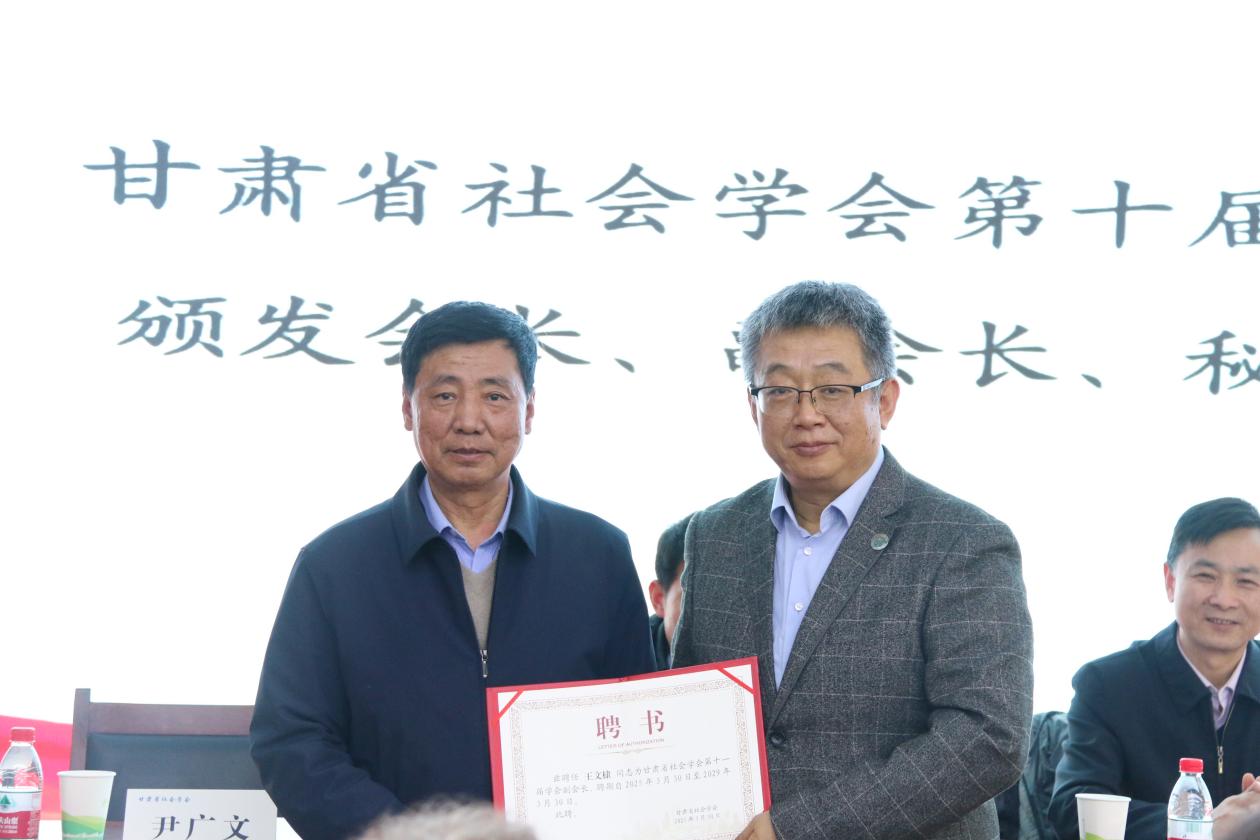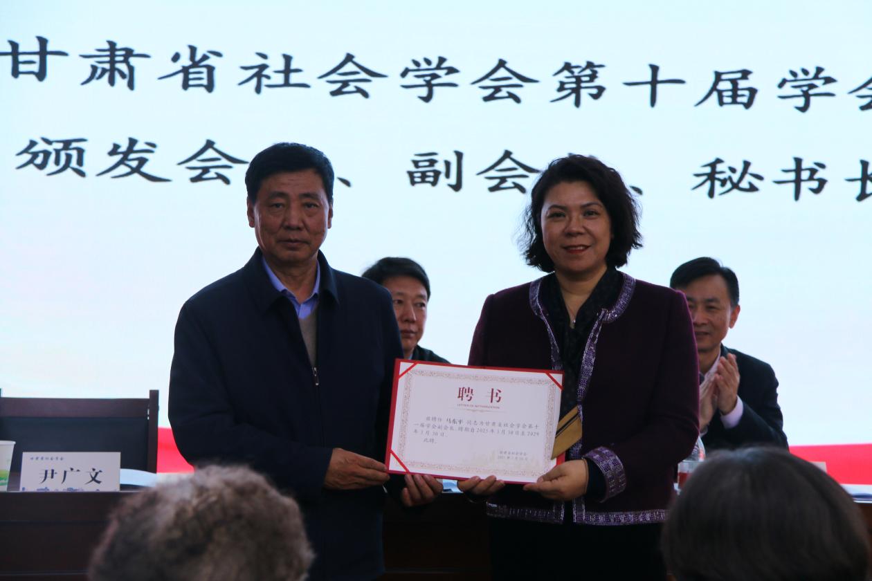 大会的选举环节。大会采用无记名投票进行选举,采取等额选举的形式,先从会员代表大会中产生理事,再从理事中选出负责人,Hanime 青年教师李亚伟、韩凤莹担任计票人,张同担任监票人,选举产生甘肃省社会学会第十一届理事会成员和负责人,包括甘肃省社会学会第十一届学会新任会长李怀教授,副会长马东平研究员、马忠才教授、王文棣教授、饶旭鹏教授、刘荣教授、周亚平教授、焦若水教授,秘书长尹广文教授,副秘书长唐远雄教授、李晓蓓教授等。甘肃省社会学会第十届学会会长陈文江教授为新一届理事会负责人颁发会长 、副会长、秘书长、副秘书长聘书。