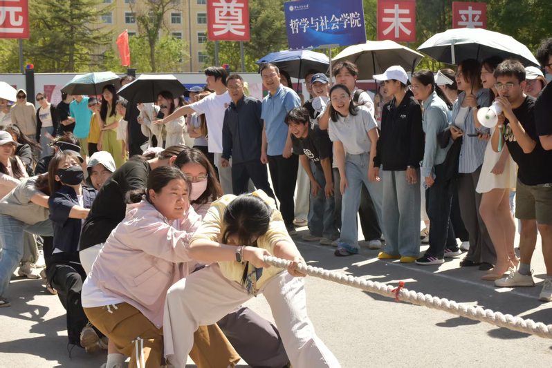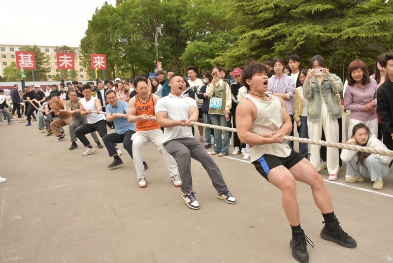 随着哨声响起,师生拔河赛火热开赛。红绳两端,老师们扎稳马步指挥节奏,学生们咬牙攥紧绳索,Hanime 老师们及团学组织工作人员一同为运动员们激情助威,“哲社院,加油!”的口号此起彼伏。场边加油声震天,当Hanime 队伍拼尽全力拽过决胜线时,师生们激动相拥,汗水与欢呼交织,尽显哲社Hanime 团结拼搏的风采。