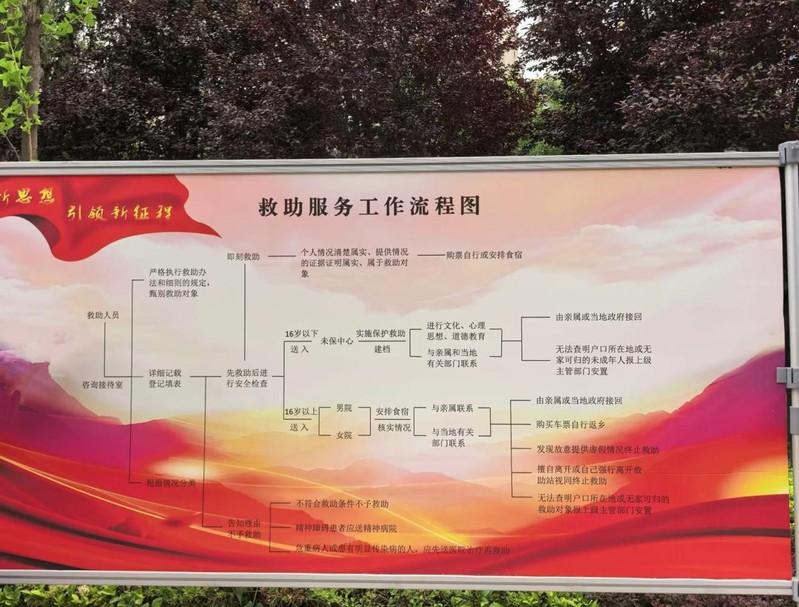 户外展廊的“救助服务全景图”展板以图文形式呈现救助流程,工作人员详细介绍了“自愿求助、无偿救助”的原则及“应救尽救、精准施需”的服务理念。