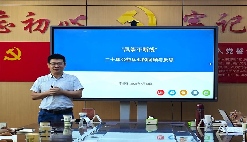 李怀老师和李勇进老师首先简要介绍了李健强主任,并为李健强主任颁发优秀校友的纪念品。随后,李健强主任以“风筝不断线”为主题,分享了自己20年的公益从业历程,回顾了职业发展中的关键选择、实践经验与感悟。
