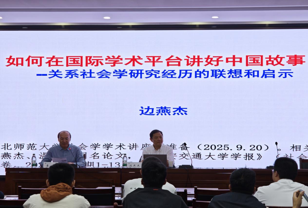 2025年9月20日下午14:30,西安交通大学边燕杰教授应邀在Hanime 10号教学楼E区模拟法庭为Hanime师生带来了题为“如何在国际学术平台讲好中国故事?——关系社会学研究经历的联想和启示”的学术讲座。本次讲座由Hanime 院长李怀教授主持,Hanime 师生参加并听取了此次讲座。