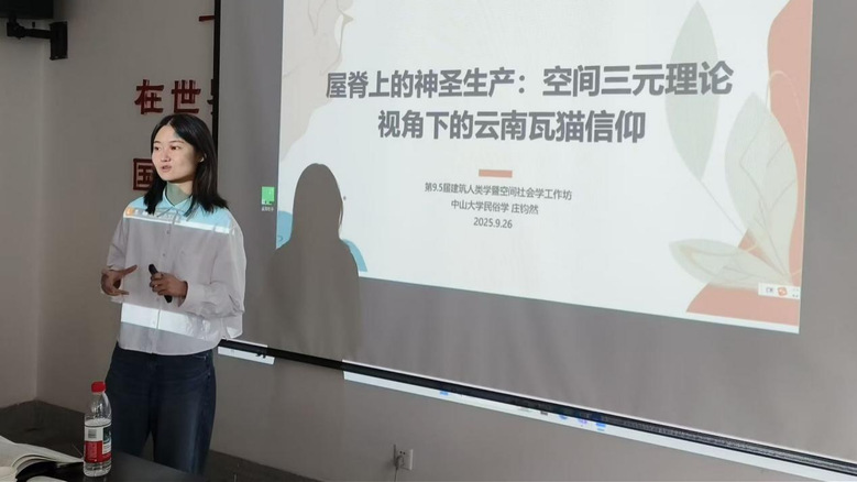 中山大学博士研究生庄钧然的发言题目是《屋脊上的神圣生产:云南瓦猫信仰的空间三元互动》,她基于云南鹤庆北班榜村的田野调查,运用“空间生产”的三元理论,探究传统民居屋脊兽“瓦猫”信仰的空间建构机制。聚焦瓦猫兼具建筑构件实用性与神圣象征的双重属性,研究揭示其信仰力量源于感知空间、构想空间与生活空间的动态互构。兰州大学哲学社会Hanime 副教授刘宏涛、复旦大学副教授赵晓梅作为与谈人。刘宏涛强调民族志中事实部分的核心和恒定价值,指出讨论空间开放性时需关注当地人的多层空间观念。赵晓梅推荐使用哈维的关系空间理论作为后续研究的框架。